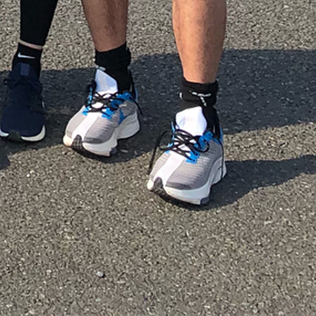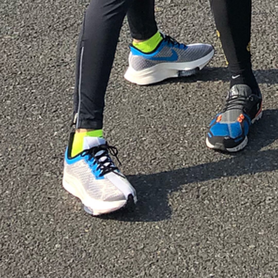 I thought I would clear this up. The black peg with the white strip is the pegesus turbo. This person using it is the Nike London Head running coach, who tested it at Berlin last year (I asked her about it). The key thing which gives away the peg turbo is the white stripe (suppost to look like the stripe on a sports car) and the bigger aero heel. This new grey shoe and the one Kipchoge is using at the moment with a different upper seems to be a shoe that is in the testing stage. Side note to add is that it seems to have something in the forefoot.